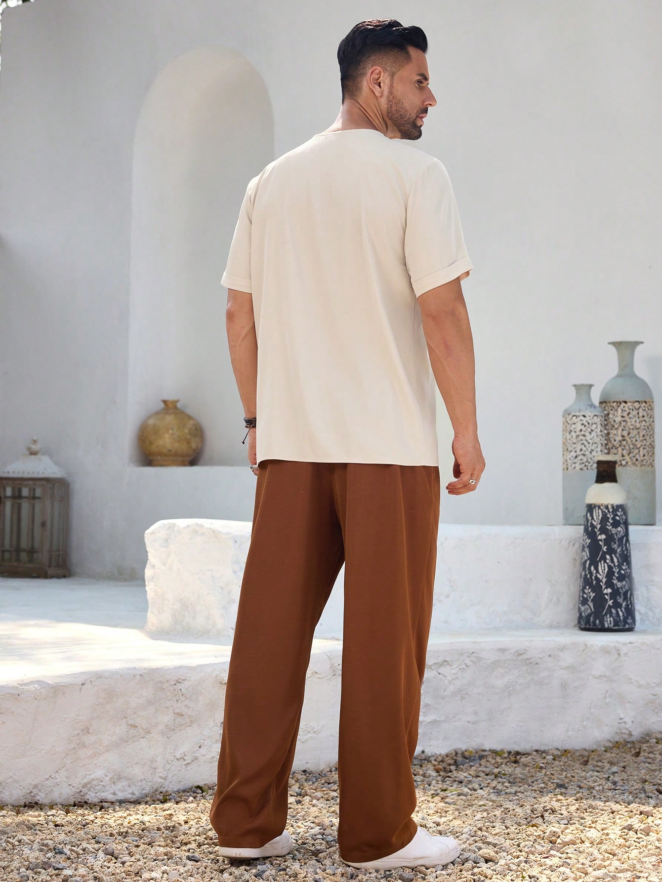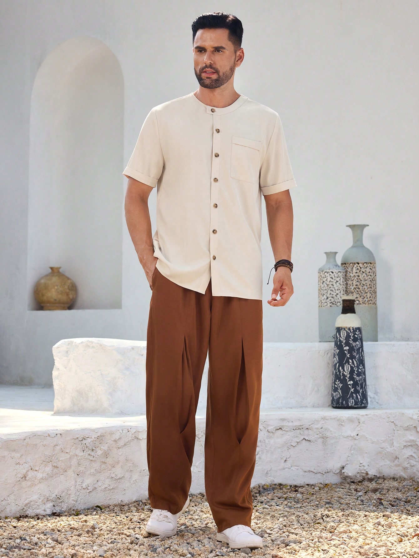 Manfinity KASUA 2pcs Men’s Solid Color Button Front Shirt And Lace-Up Pants Set