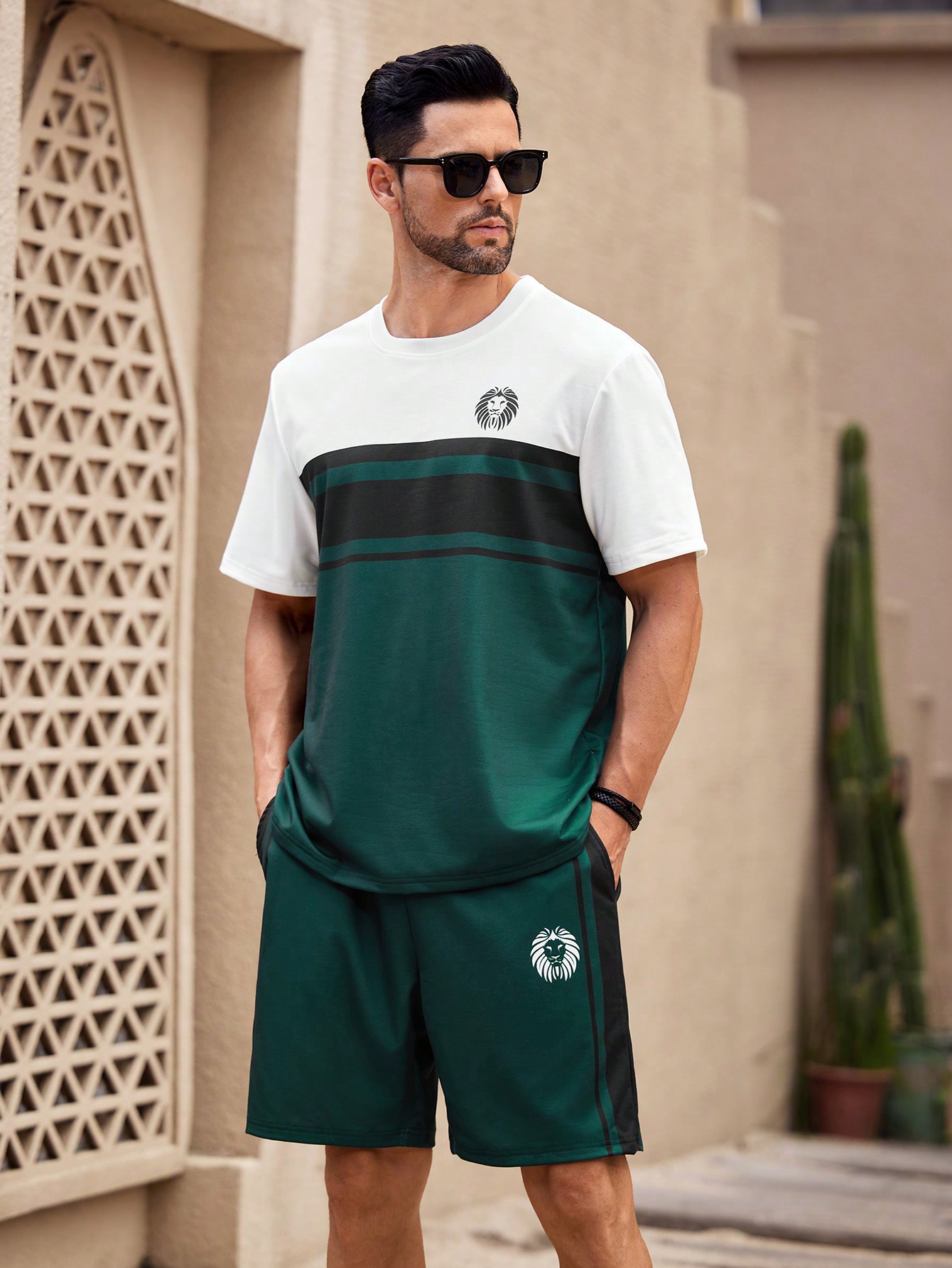 Manfinity KASUA Green & White Patchwork T-Shirt And Shorts Set
