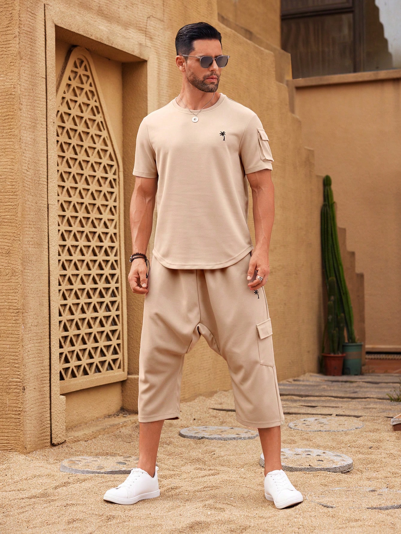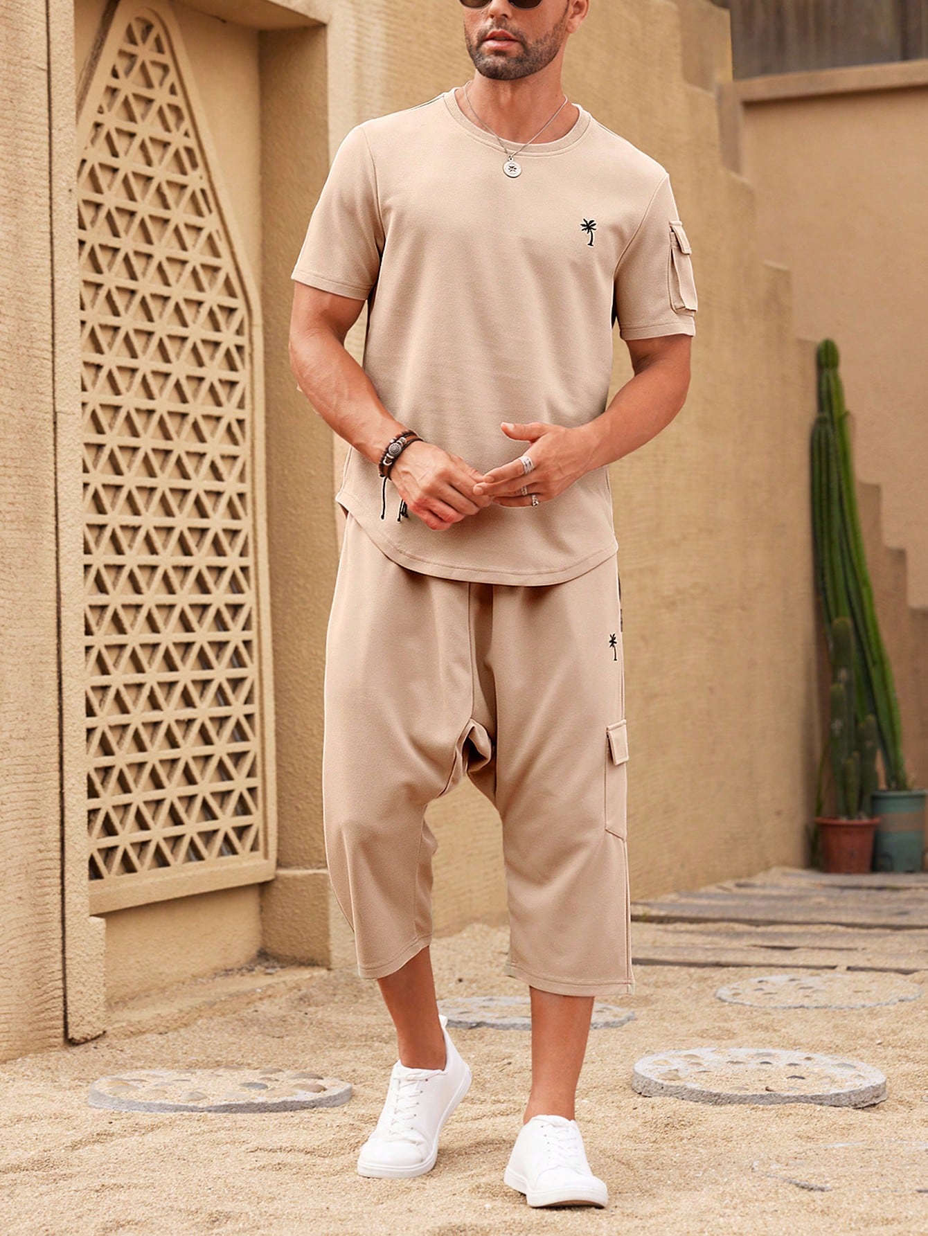 Manfinity KASUA Men’s Summer Palm Tree Printed Workwear Pocket Short Sleeve T-Shirt And Pants Casual Outfit, Going Out, Husband